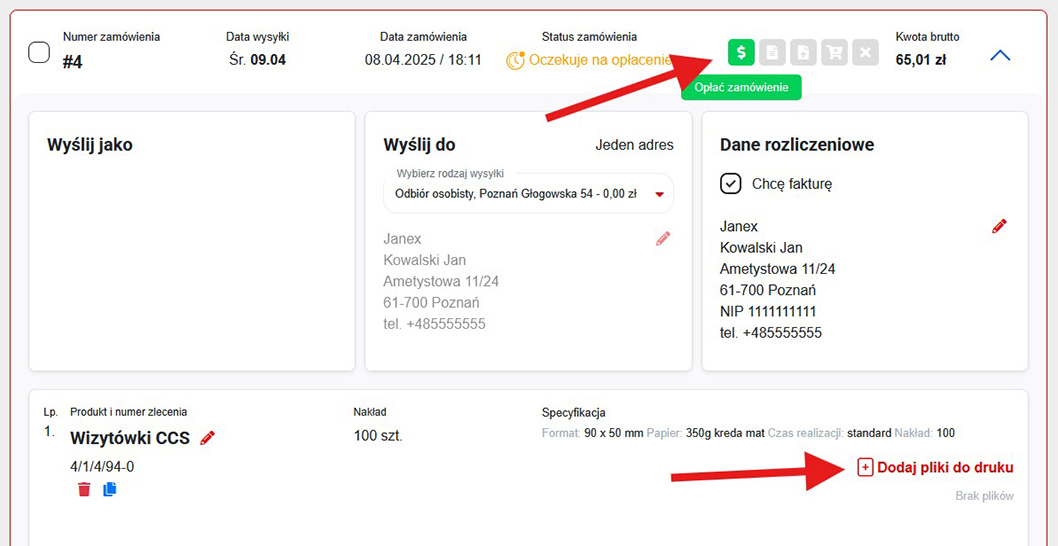 W zależności od tego w której zakładce znajduje się aktualnie Twoje zamówienie, taki jest jego status. Jeśli zamówienie nadal znajduje się w zakładce "Oczekujące" to znaczy, że nie dokonałeś jeszcze płatności lub nie załączyłeś plików do druku.